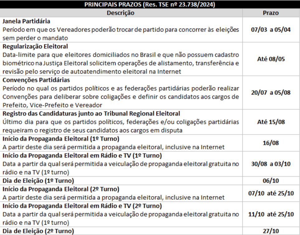 Além disso, é igualmente importante conhecer a legislação que regula o processo eleitoral. Orientamos que leia a Resolução nº 23.738, de 27 de fevereiro de 2024, do Tribunal Superior Eleitoral (clique aqui para baixá-la), que estabelece o calendário eleitoral para as eleições municipais de 2024. Trazemos abaixo os principais prazos que devem ser observados por aqueles que desejam ocupar cargos políticos em seus Municípios a partir do ano que vem: